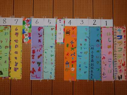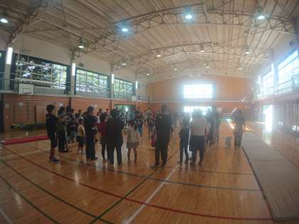 旭小の体育館では、4校の児童が一緒に歌を歌ったりゲームをしたりしながら、楽しく交流しています。