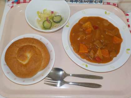 本日の給食は、はいがパン・ぶた肉のシチュー(グヤーシュ)・野菜サラダ・牛乳です。