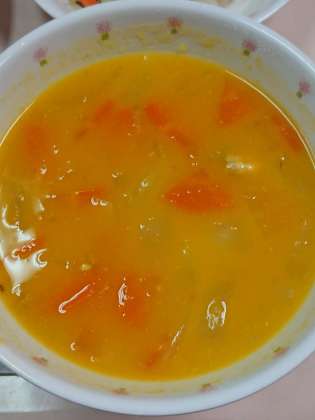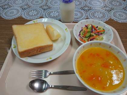今日の給食は、「おはなし給食」の2回目で、かぼちゃスープが出されました。