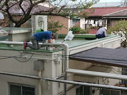 排水溝が詰まっているせいだろうということで、今日は学校主事さんが屋上に登り、排水溝にたまった落ち葉や砂などを手で取り除く作業をしています。