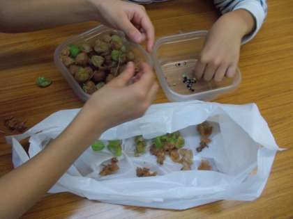 風船カズラの実から種を取り、