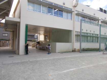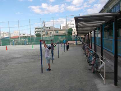 外遊びの準備をお手伝いの児童が