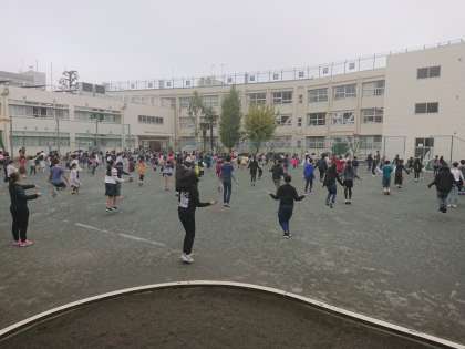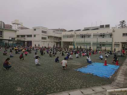 先週の週末に降り続いた長雨もやっとおさまり、今朝は曇り空のもと、校庭で「短なわ集会」が行われました。