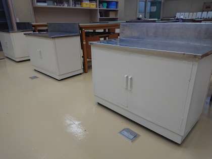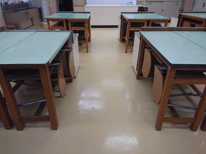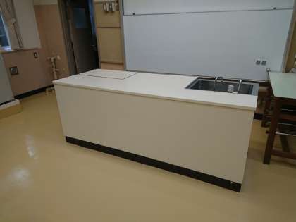 その中の家庭科室は、以前から床や机、コンロ収納台などの傷みがひどく、主事さんに修繕をお願いしていました。