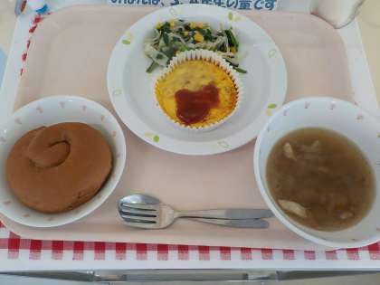 本日の給食は、ココアパン・チーズ入り卵焼き・ほうれん草サラダ・オニオンスープ・牛乳です。