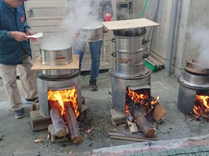 薪で火をおこしてもち米をふかしたり、雑煮の大鍋のお湯を沸かしたり、臼と杵を校庭に運んだりと、手際よく作業が進められました。