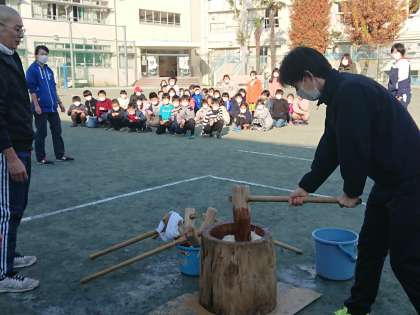 12月14日(土)、穏やかな冬の日差しのもと、PTA主催のもちつき大会が始まりました。