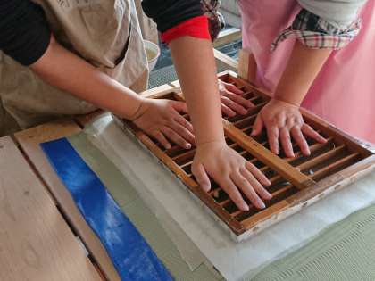 はじめに全員そろって作り方の説明を聞き、そのあと5人ずつに分かれて、パルプとミツマタの2種類の原料を使い、2層の紙を重ねて手で押して水分を抜きます。