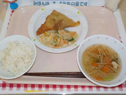 本日の給食は、麦ごはん・ツナじゃがフライ・春雨サラダ・もやしスープ・牛乳です。