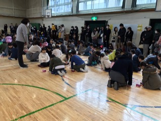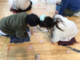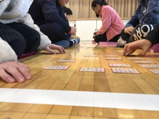 全校児童が体育館に集合し、百人一首大会を行いました。