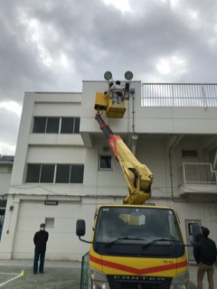 今日、高所作業車を使って修理していただき、見事復活を遂げました。