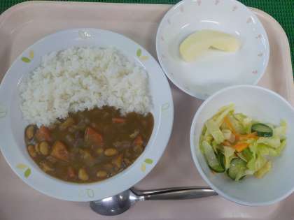 本日の給食は、スリランカカレー・野菜サラダ・りんご・牛乳です。