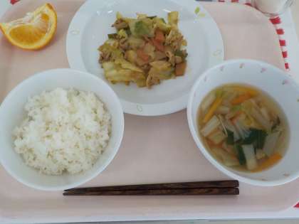 本日の給食は、ごほん・回鍋肉・白菜とビーフンのスープ・いよかん・牛乳です。