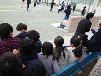 子どもは元気だなあと感心していると、校庭の隅のベンチのところには、なにやら大勢の子どもたちがひしめき合って座っています。これって「猿団子」みたいです。体を寄せ合って寒さをしのいでいるのでしょう。