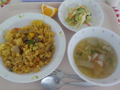 本日の給食は、カレーピラフ・チーズドレッシングサラダ・野菜スープ・牛乳です。