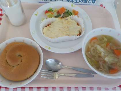 本日の給食は、コーヒーパン・シェパードパイ・ひよこ豆と大麦のスープ・カラフルサラダ・牛乳です。