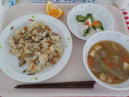 本日の給食は、豆入りかやくごはん・いわしのつみれ汁・かぶときゅうりの酢の物・くだもの(はるみ)・牛乳です。