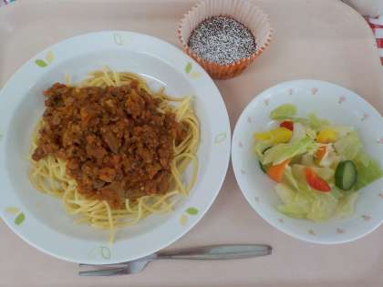 本日の給食は、スパゲティミートソース・グリークサラダ・チョコケーキ・牛乳です。