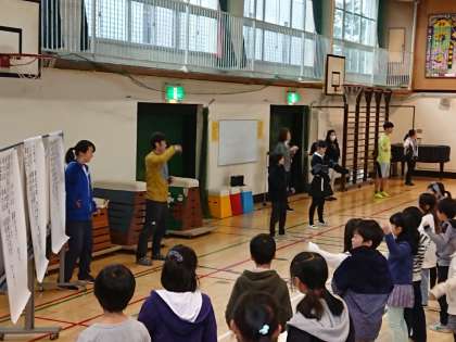 ホワイトボードには大きく歌詞が貼り出され、児童は体育館一杯に広がり、曲に合わせてリズムよく踊ります。