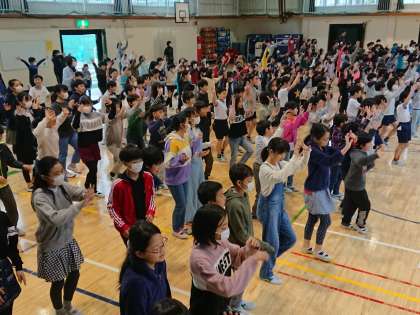全校児童が一緒に歌い、踊った曲は「心の羽根」です。