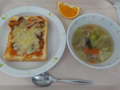本日の給食は、ピザトースト・田舎風スープ・くだもの(清見オレンジ)・牛乳です。