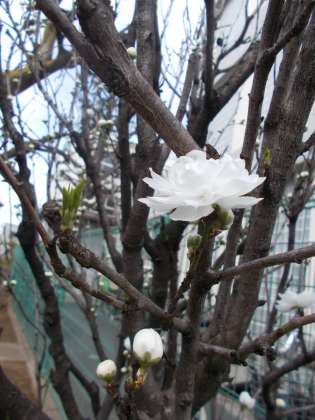 校門の脇の白梅(大輪緑萼ダイリンリョクガク)が