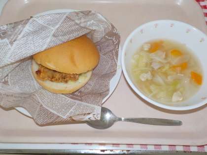 本日の給食は、カツバーガー・レンズ豆入り野菜スープ・牛乳です。