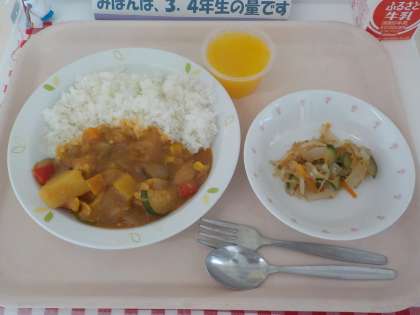 本日の給食は、夏野菜のカレーライス・こんにゃくサラダ・みかんゼリーです。