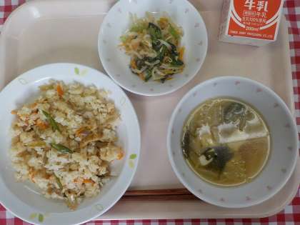 本日の給食は、とりめし・豆腐汁・野菜のごまだれがけ・牛乳です。