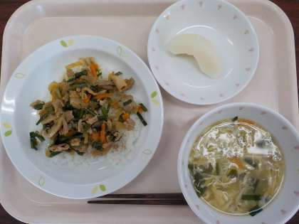 本日の給食は、プルコギ丼・卵とわかめのスープ・梨・牛乳です。