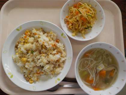 本日の給食は、チャーハン・もやしのコチュジャンあえ・ビーフンスープ・牛乳です。