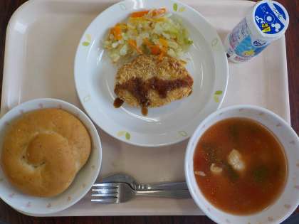 本日の給食は、セサミパン・ポテトコロッケ・キャベツサラダ・ミネストローネ・牛乳です。