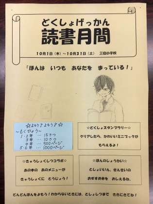 10月は三宿小学校の読書月間です。毎年恒例「読書貯金通帳」の取組みなど、さまざまな企画をしています。具体的な内容はポスターをご覧ください。