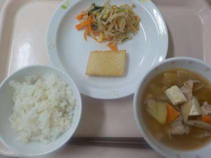 本日の給食は、麦ごはん・いかの照り焼き・こまあえ・豚汁・牛乳です。
