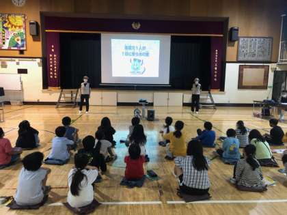 今日「水滴くん」の本拠地(東京都水道局)からお兄さん、お姉さんが来てくださり、4年生に「水道キャラバン」を開催してくださいました。