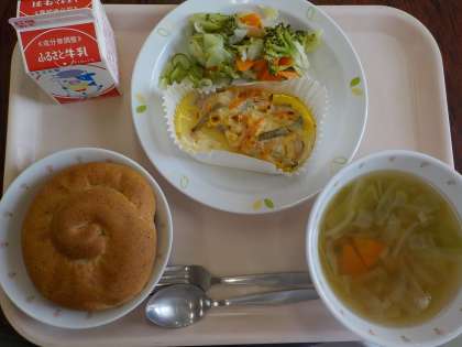 本日の給食は、胚芽パン・鶏肉のコーンマヨネーズ焼き・温野菜サラダ・コンソメスープ・牛乳です。