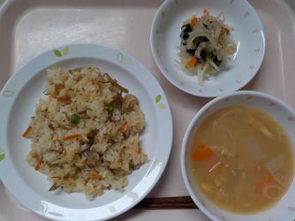 本日の給食は、鶏とごぼうのごはん・和風サラダ・呉汁・牛乳です。