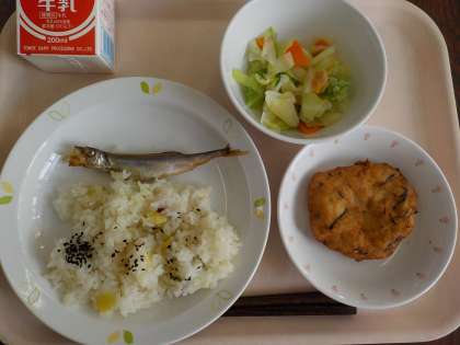 本日の給食は、さつまいもごはん・手作りさつまあげ・焼きししゃも・ひとしお野菜・牛乳です。