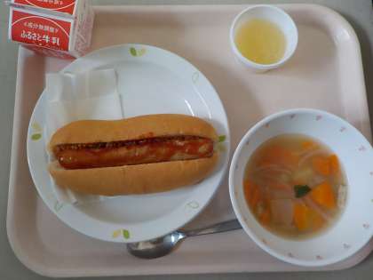 本日の給食は、ホットドッグチリソース・もち麦スープ・もものゼリー・牛乳です。