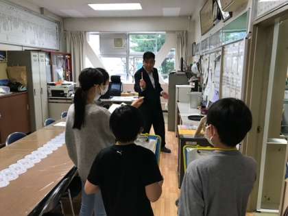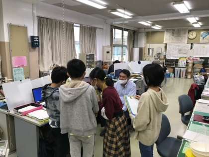 5年生の英語の時間です。学校内を巡り、いろんな先生に英語で質問しています。