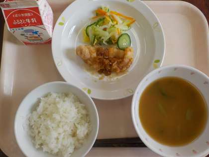 本日の給食は、ごはん・とり肉の香味かけ・ひとしお白菜・小松菜のみそ汁・牛乳です。