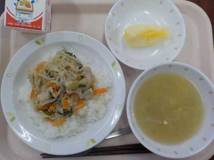 本日の給食は、塩豚丼・長ねぎとコーンのスープ・りんご 牛乳です。