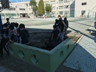 砂山を崩しながら地形を変え、水の流れがどう変化するかの実験だったと児童が親切に教えてくれました。