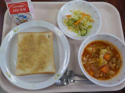 本日の給食は、セサミトースト・ボルシチ・コールスロー・牛乳です。