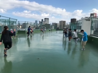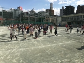 中休みに高学年が見本を見せながら、全校でダンスを楽しみます。