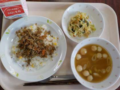 本日の給食は、むろあじそぼろ丼・切干大根のあえもの・麩のみそ汁・牛乳です。