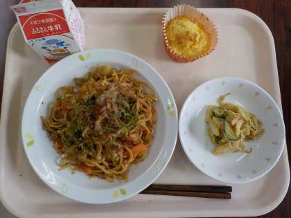 本日の給食は、屋台風やきそば・野菜のごま酢あえ・りんごマフィン・牛乳です。