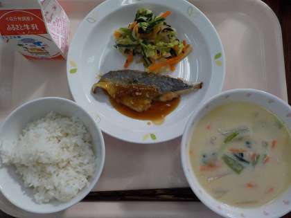 本日の給食は、麦ごはん・魚のしょうが風味焼き・小松菜と白菜ののりあえ・和風チャウダー・牛乳です。
