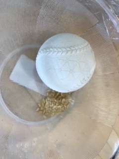 籾すりのツールはすり鉢と野球のボール。優しくゴリゴリしてから籾殻を取り除くと玄米の出来上がりです。