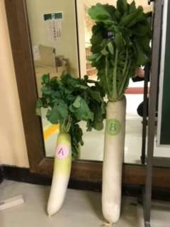 写真は大蔵大根と青首大根の実物を見せるために展示しているところです。